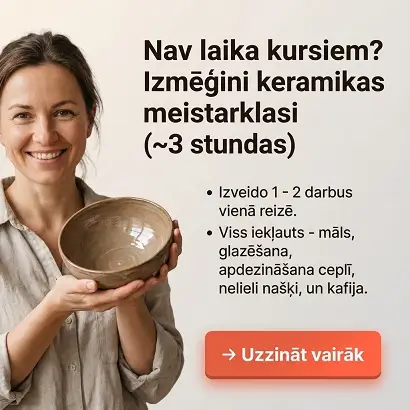 Kursos apgūsiet keramikas pamatus, iegūsiet jaunas prasmes un plašāku ieskatu disciplīnā. Iemaņu uzlabošanā vēlams turpināt darbu pastāvīgi vai piedalīties keramikas darbnīcas organizētajos pasākumos un nodarbībās.